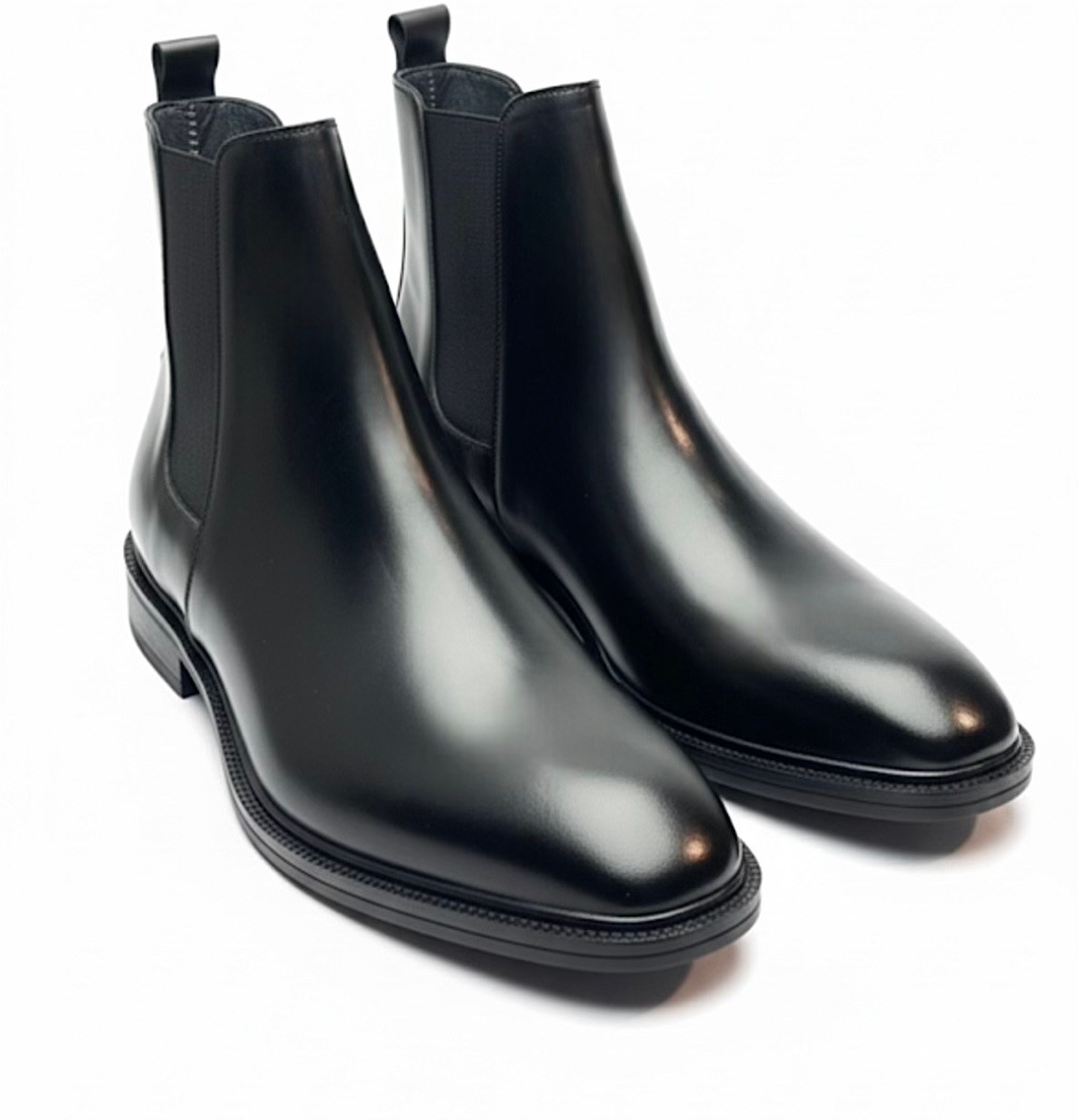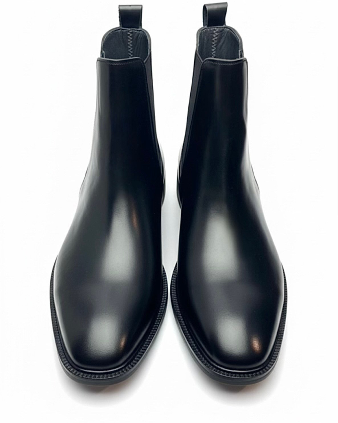 Men’s Chelsea boots with a minimalist design inspired by classic European style. Features a natural cowhide leather upper with a shiny surface, a breathable goatskin lining, and a durable rubber outsole. Replaceable insole, reinforced with industrial adhesive and stitching. Suitable for everyday, formal, and semi-formal wear.