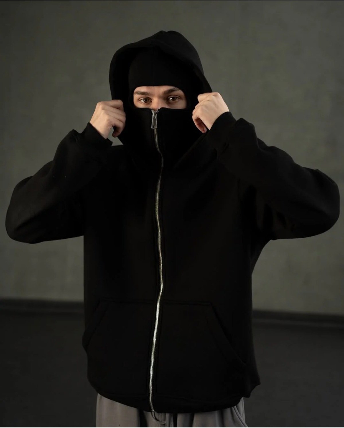 خرید سویشرت ورزشی نینجا یونیسکس مشکی با طراحی ماسک‌دار و کلاه‌دار، مناسب استایل اسپرت و خیابانی ترند.