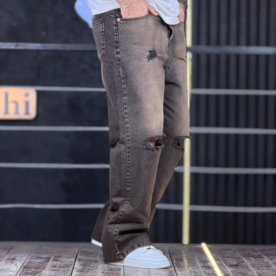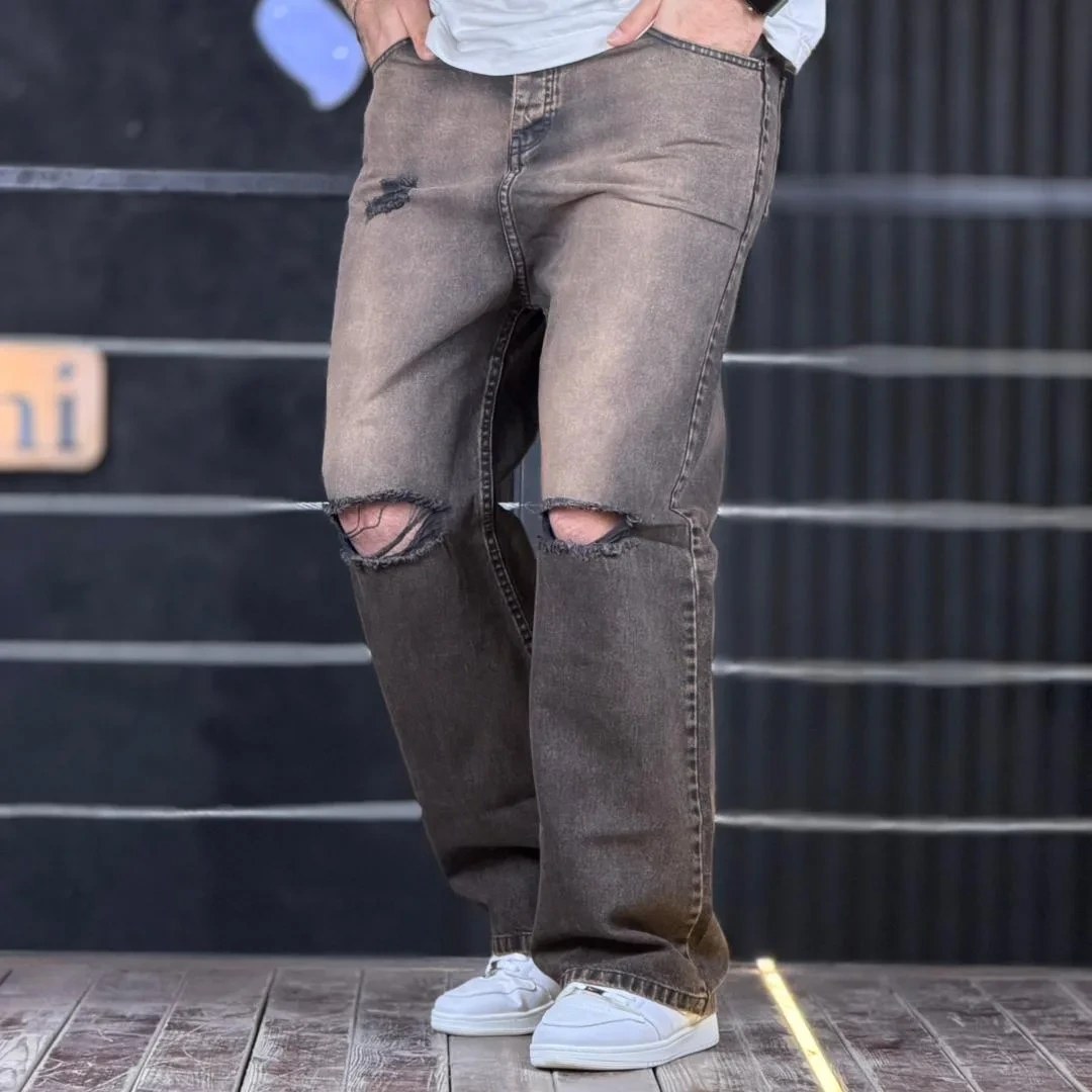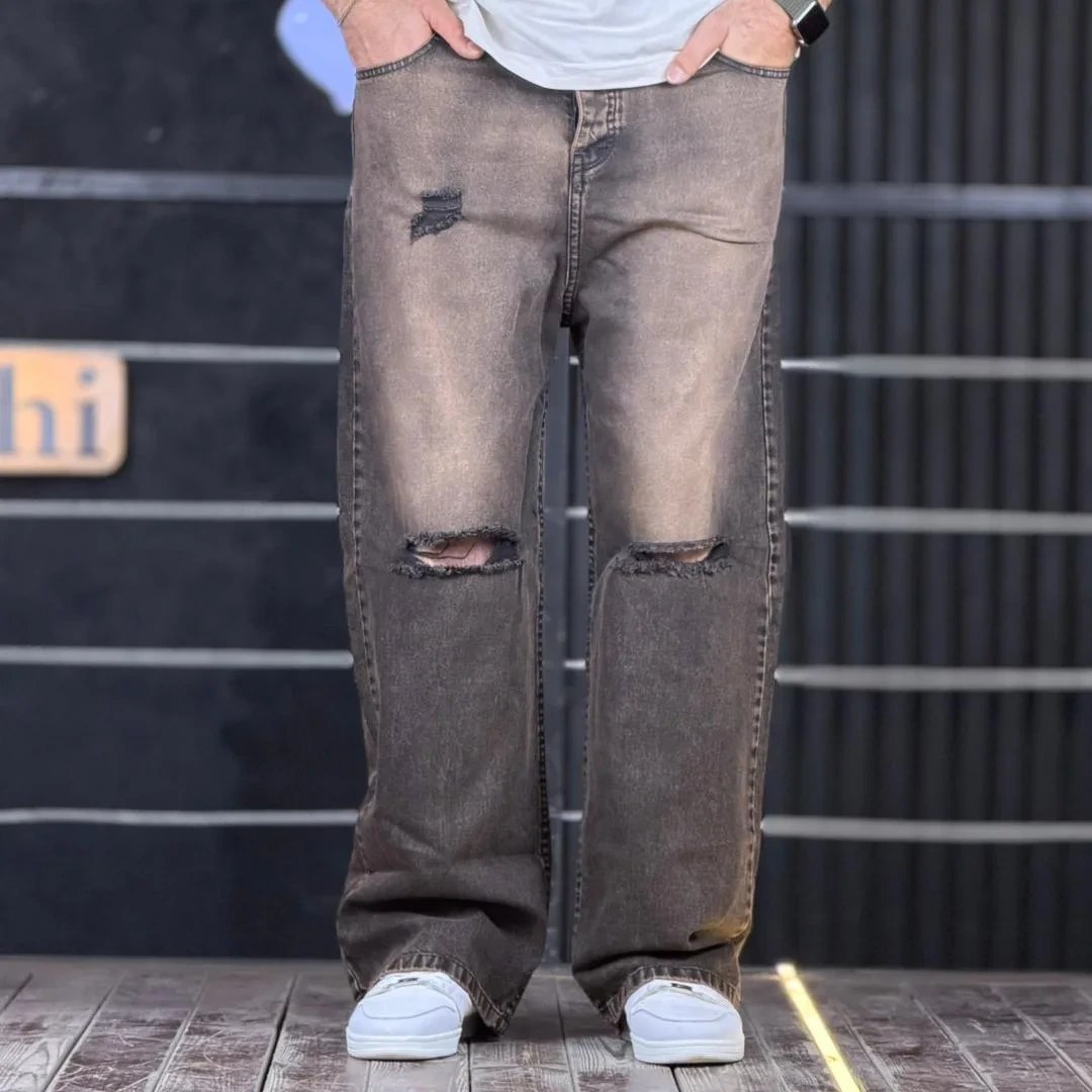 شلوار جین بگ قهوه ای تینت دار زانو زاپ ، انتخابی خاص برای استایل خیابانی و اسپرت.