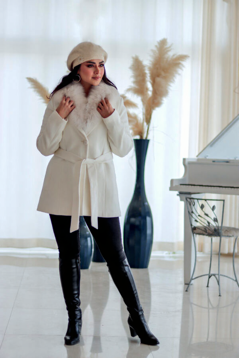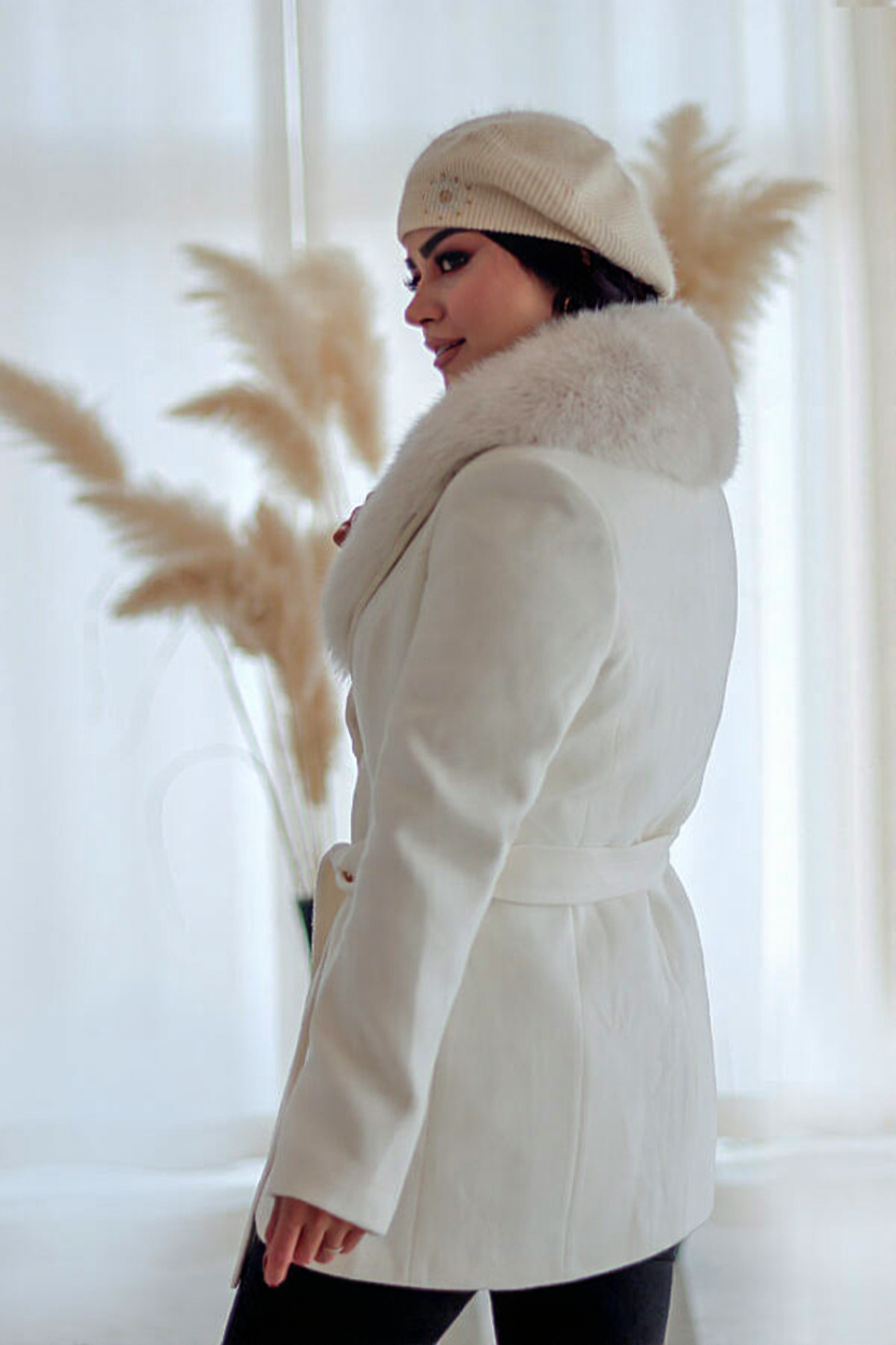 كت پالتو خزدار سفيد برش دار جيب دار تك دكمه